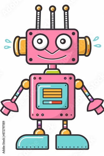 A pink robot, featuring two arms and legs, stands before a pristine white backdrop, its face expressing a cheerful smile