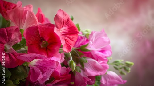 A pink tablecloth holds a vase filled with red and pink flowers Another vase, white, is topped with pink and red blooms