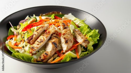 a salad with chicken, carrots, lettuce, and carrots in a black bowl on a white surface with a person holding a fork in their hand.