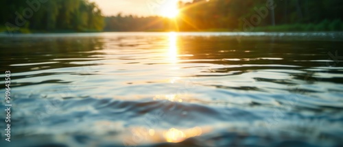 A scene featuring a tranquil body of water with trees lining the background and the sun mirrored on its surface in the foreground