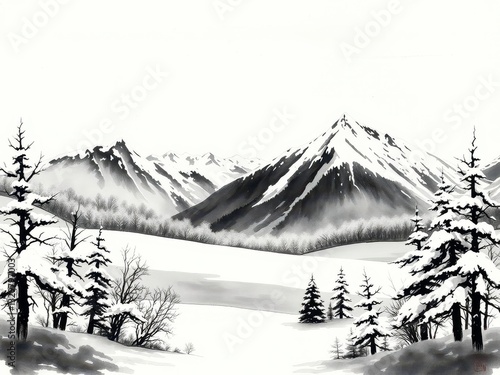 A serene winter scene in ink painting, with snow covered trees and distant mountains, all captured with elegant brushstrokes in