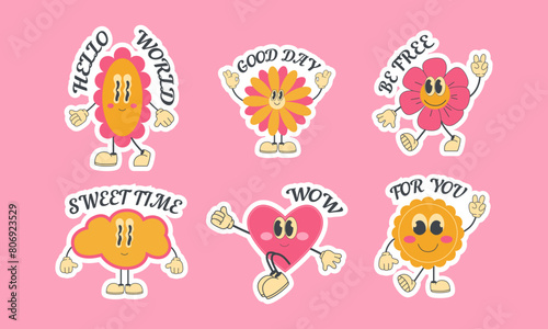 A set of stickers of cartoon groovy characters with inscriptions in the style of the 90s, 2000s. 2000s elements set