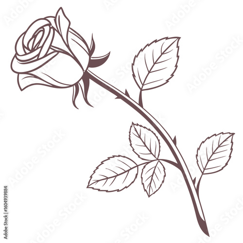 A simple rose icon with a curved stem and two leaves, designed with minimalistic details.