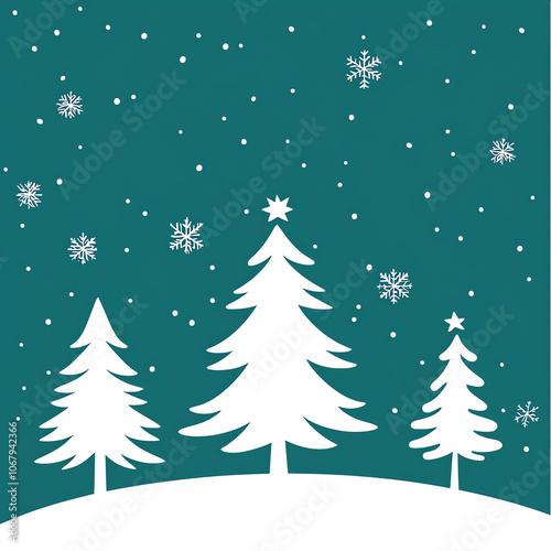 A simple vector illustration depicting white snow falling on pine trees, set against a dark teal background with white stars and snowflakes.