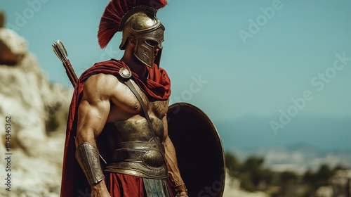 a spartan warrior standing in front of a mountain, wearing a helmet and holding a sword and shield The background is blurred, giving the image a sense of depth