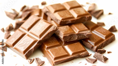 A stack of chocolate pieces on a white table Nearby, a stack of similar chocolate pieces on a white countertop