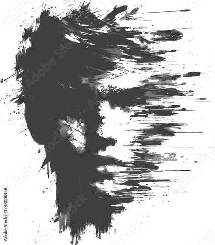 A striking abstract portrait where a human face dissolves into bold black ink strokes and splatters. The composition conveys mystery, motion, and creative energy, ideal for artistic branding