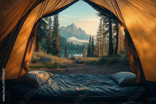 A stunning view from inside a cozy tent, revealing a tranquil landscape of a serene mountain lake surrounded by lush pine trees and rugged mountains in the distance.