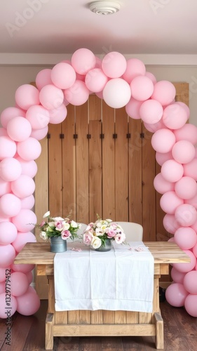 A Sweet Pastel Pink Balloon Arch Framing a Rustic Wooden Table Decorated with Fresh Blossoms