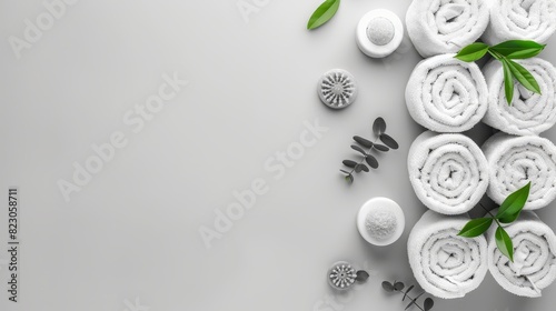 A table holds a stack of white towels, adjacent are scissors and a green leaf