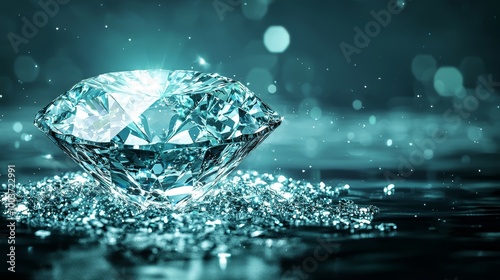 A tight shot of a diamond atop a reflective surface, surrounded by a hazy background and softly focused lights in the distance