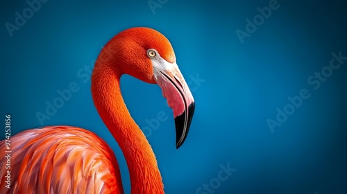 A tight shot of a pink flamingo against a blue backdrop, featuring a black speck at image's heart