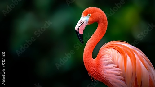 A tight shot of a pink flamingo against a softly blurred background of green foliage
