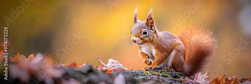 A tight shot of a squirrel perched on a rock Leaves scatter the foreground Background softly blurred