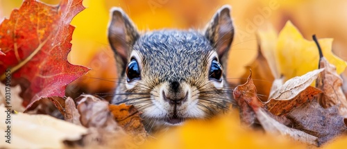 A tight shot of a squirrel's expressive face, surrounded by vibrant autumn leaves in the foreground, and a solitary maple leaf in the backdrop
