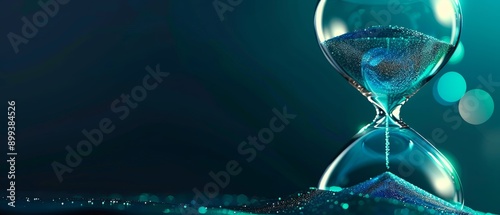 A tight shot of an hourglass against a blue backdrop, illuminated from above by soft beams of light