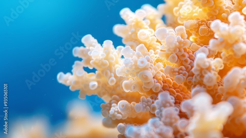 A tight shot of an orange-white sea anemone against a backdrop of a blue sky