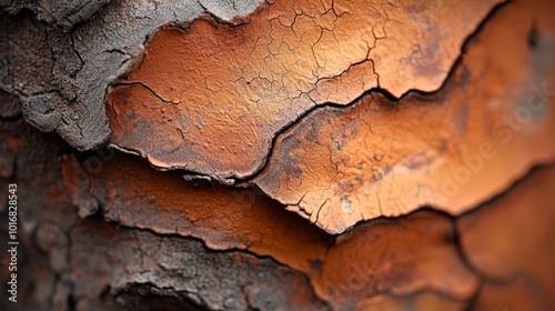 A tight shot of tree bark, colored orange and brown with distinct brown streaks from the paint application
