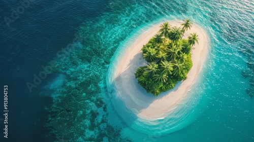 A tiny isle amidst tranquil waters, clad in palm trees on one bank, blue expanse on the other