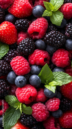 A vibrant assortment of fresh strawberries, raspberries, blueberries, and blackberries with mint leaves.