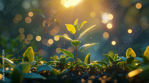 a vibrant young sapling illuminated by the gentle rays of dawn, juxtaposed against a backdrop of blurred bokeh lights, embodying the harmonious fusion of natural beauty and technological artistry.
