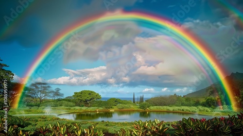 **: A vivid rainbow shines over the Hoomaluhia Botanical Garden in Kaneohe, Hawaii, with the garden's rich plant life and a calm pond beneath the colorful arch.