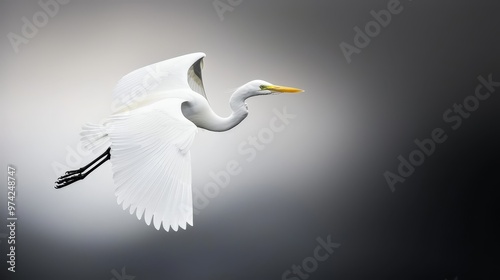 A white bird flies in the air, wings spread wide, head tilted to the side