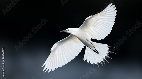 A white bird soars through the air, wings fully extended, gaze diverted to one side
