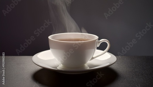 A white ceramic cup filled with coffee, gentle steam rising, placed centrally with a plain b