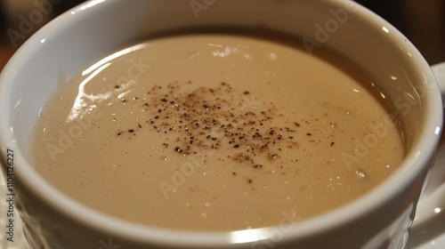 a white cup of coffee sitting on top of a saucer on a table The cup is filled with a steaming hot liquid, likely coffee, and the saucer is a complementary color to