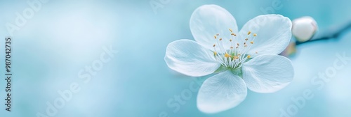 A white flower on a branch, closely framed Background softly blurred Light blue sky above