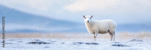 A white sheep stands in the midst of a snow-covered field Mountains loom in the distant background, their peaks reaching towards the wintery sky