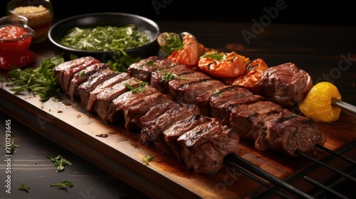 a wooden cutting board topped with meat and veggies next to a bowl of sauce and a bowl of tomatoes.