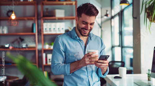 A young man in a casual blue shirt engages with his smartphone, smiling as he reads a message, showcasing the ease of staying connected in a modern, comfortable office environment.
