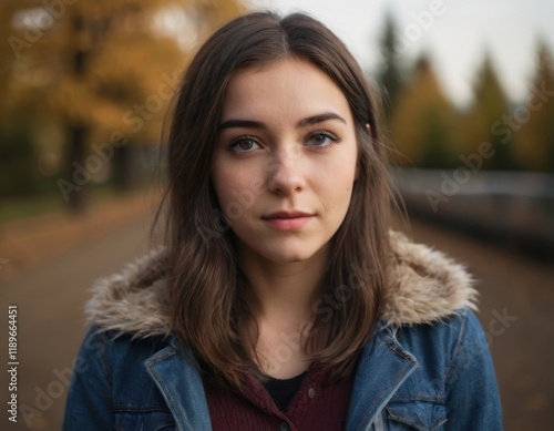 a young woman with shoulder-length brown hair and a calm expression on her face. She is wearing a denim jacket with a fur-lined collar over a dark top