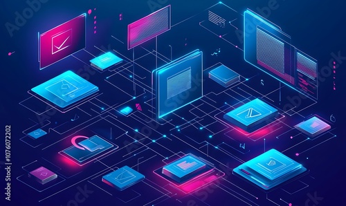 Abstract network grid with files and folders, futuristic software interface, digital document management system, store, search and organize documents, corporate business, paperless office