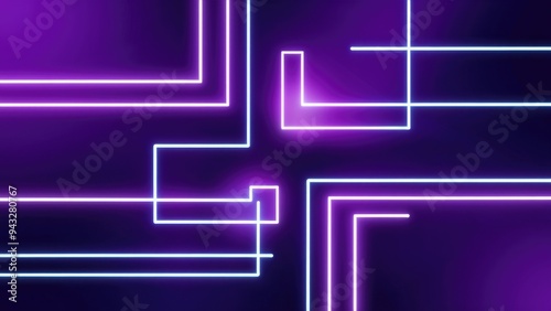 Abstract purple and blue neon background featuring geometric shapes. Modern minimalist design with glowing lines and rectangles.