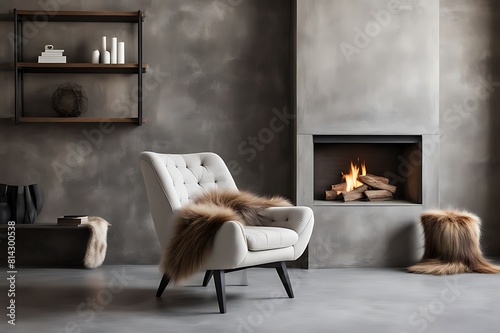 Accent chair with fur throw against concrete wall with fireplace. Loft home interior design of modern living room.