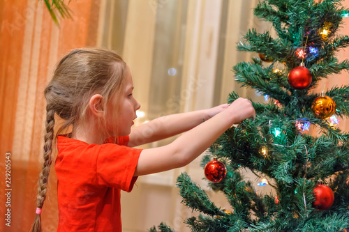 Adorable little girl decorating a Christmas tree with colorful glass baubles at home