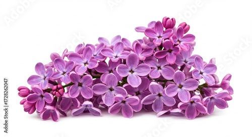 明るいスタジオ照明の下で純粋な白い背景に美しく際立つ鮮やかな紫色のライラックの群れ一つ一つの小さな花びらが春の喜びと生命力を優雅に表現する. AI Generated