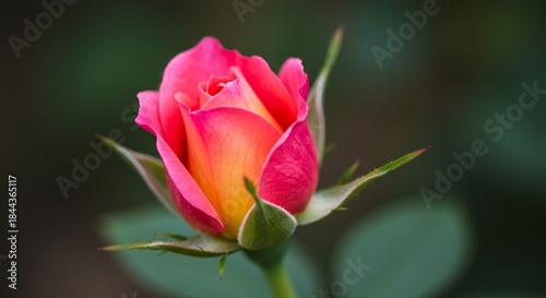 朝の柔らかい光を浴びて瑞々しく咲き始めたばかりのバラのつぼみ鮮やかなフューシャピンクと優しいアプリコットオレンジのグラデーションが繊細な花びらの質感を引き立て希望に満ちた美しい開花を予感させる. AI Generated