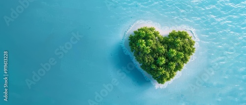 An aerial perspective reveals a heart-shaped island encircled by water, dotted with trees at its center