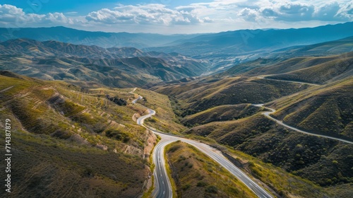 an aerial view of a winding road in a mountainous area with a view of a valley and mountains in the distance with a blue sky and white clouds in the background.