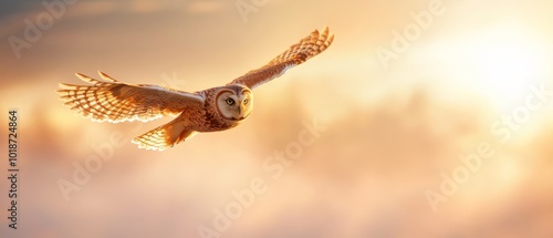 An owl flies against a backdrop of sun, clouds, and sky