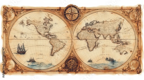 antique world map with intricate detailing, showcasing ships and compass roses, offering a glimpse into historical exploration and navigation routes.