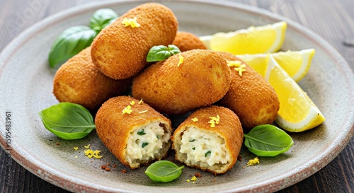 Artisan-style croquettes served on ceramic plate, with lemon wedges, basil leaves, and grated nutmeg