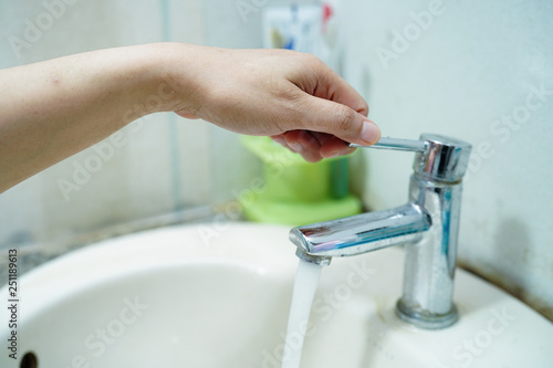 Asian middle-aged lady woman patient open the faucet to washing hands in the hospital ward : healthy medical concept