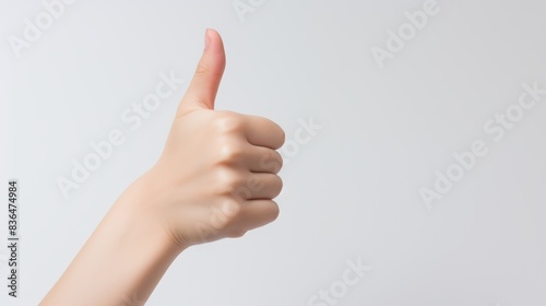 Asian woman's hand with neatly manicured nails giving a playful thumbs up against white background