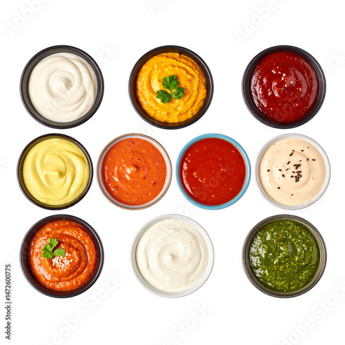 Assorted Dipping Sauces in Small Bowls – Top View Culinary Elements on Transparent Background