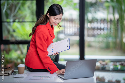 Attractive young smiling Asian woman in smart casual wear and holding smart phone looking at camera while leaning on desk in creative office Confident business expert